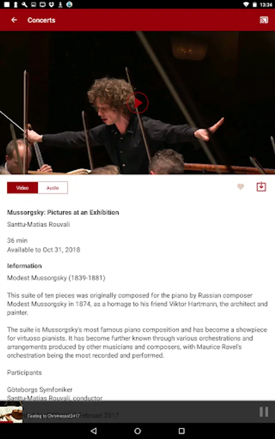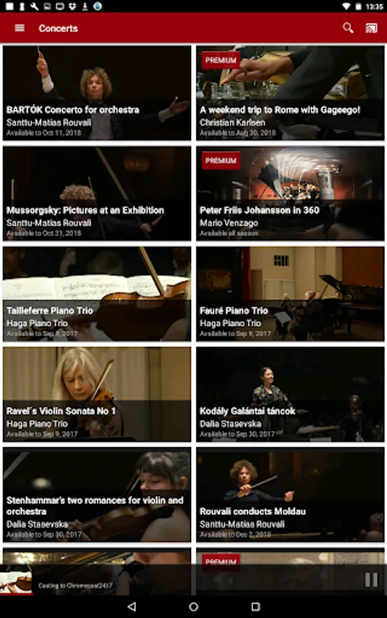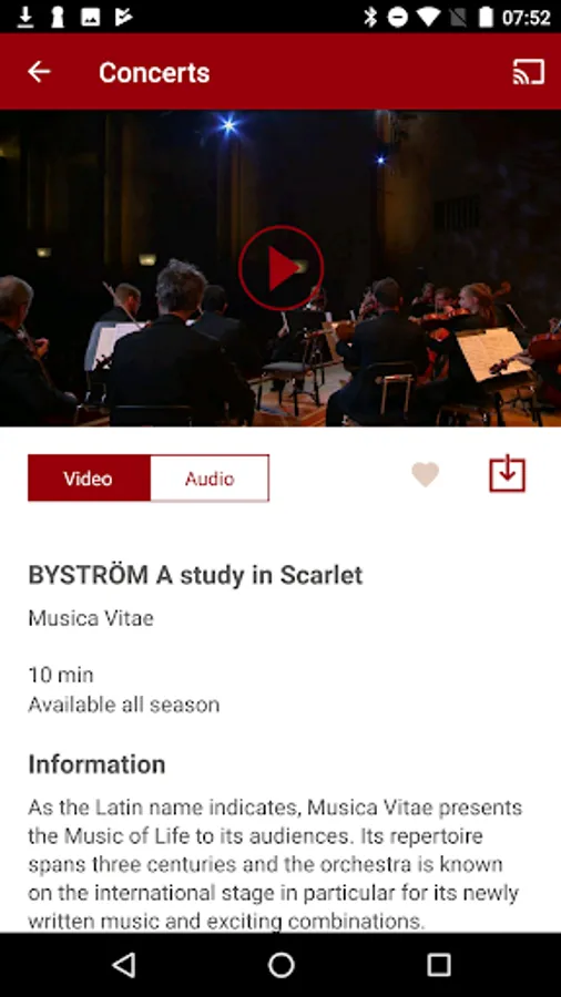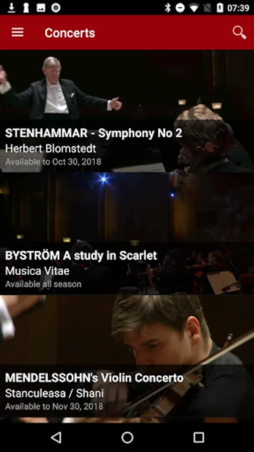 Enjoy classical music in HD, live recorded with the National Orchestra of Sweden, the Gothenburg Symphony Orchestra. The subscription for the premium version is for a period of one year. Watch and listen to concerts for free and offline. For upcoming live broadcasts you can add a calender event to your device so you won't miss it. During the season (September-June) we record two or three new concerts each month.