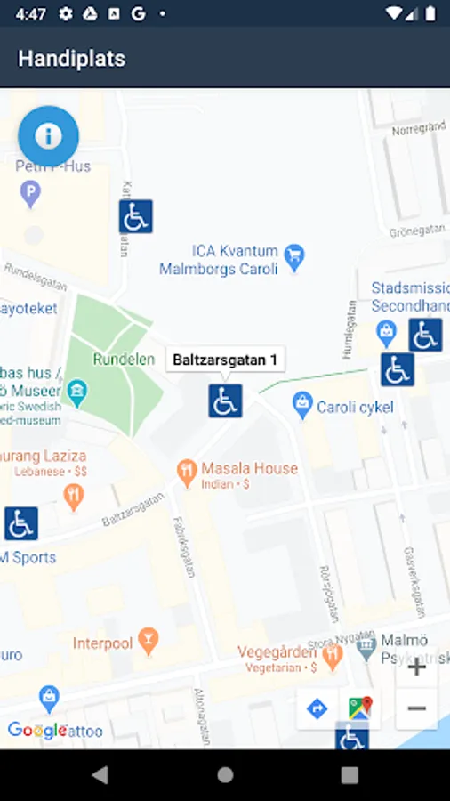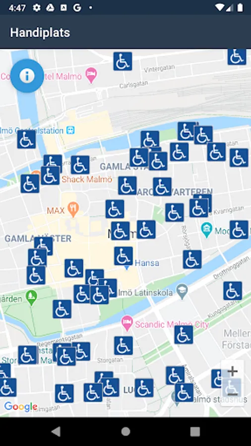 Handicap is an app that shows handicap locations on a map. The app shows parking spaces for over 110 of Sweden's municipalities. I who have developed the app have written to all 290 municipalities in Sweden and asked for map data. Then I manually entered all the coordinates for which there are data.