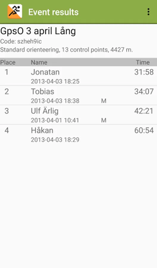 It is simple to arrange a training event with the GPS Orienteering app. Just publish a course (and map) inside the app. The participants can download the course, run the course and upload their result. Everyone can then download the results and see a result table for the event, view and replay the tracks and more. All within the app!