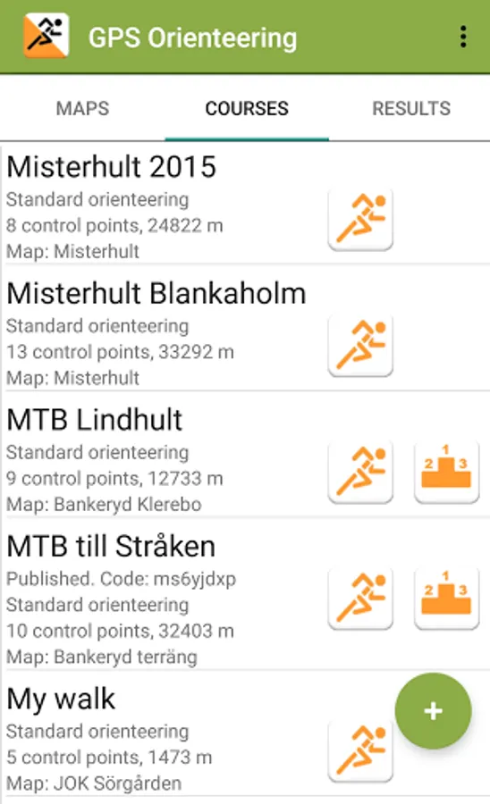The courses can be one of four different types: standard orienteering, free order orienteering, rogaining or scatter orienteering.