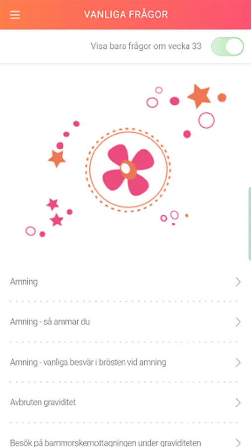A calendar that lets you follow your pregnancy week by week. Here you can read about the child, mother and partner as well as share your pregnancy with loved ones on social media. You can also watch a movie showing what the fetus looks like right now.