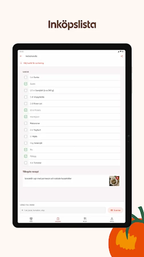 Add full recipes, featured ingredients or deals to your shopping list. Share the list with your household and sort it by your ICA store. If you scan yourself, you can also see your shopping list directly in the scanning handle in most stores.