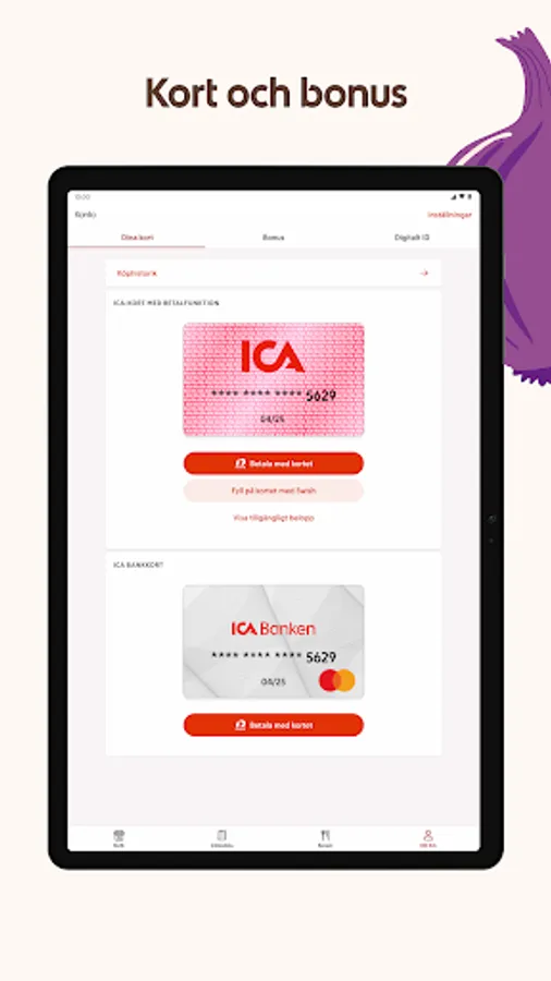 See your linked cards and your bonus. If you have a payment card from ICA or ICA Banken, you can pay directly on your mobile when you shop in store.