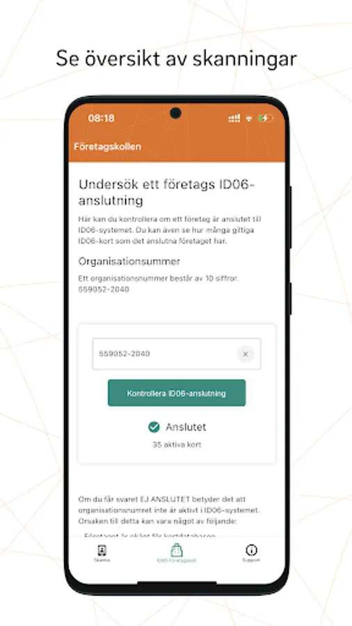 With ID06 Status Control for private individuals, you can check whether an ID06 card is active and view educations linked to an ID06 card. You also get access to the ID06 Business Directory, where you can check if a company is connected to ID06.
