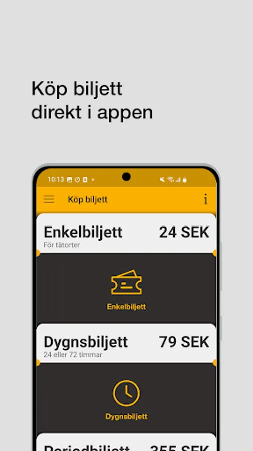 In the app, you can buy mobile ticket for short and long trips. Secure payment is made by bank card, monthly bill or company account.