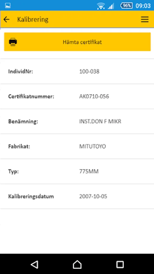 This app is a version of Intertek's Instruments Register SIR adapted for mobile phones and tablets. The app allows you to search for measuring instruments, either through their individual number or via the QR / bar codes. Once you find an instrument you can view information about it and download the calibration certificate, which you can read in any PDF reader.