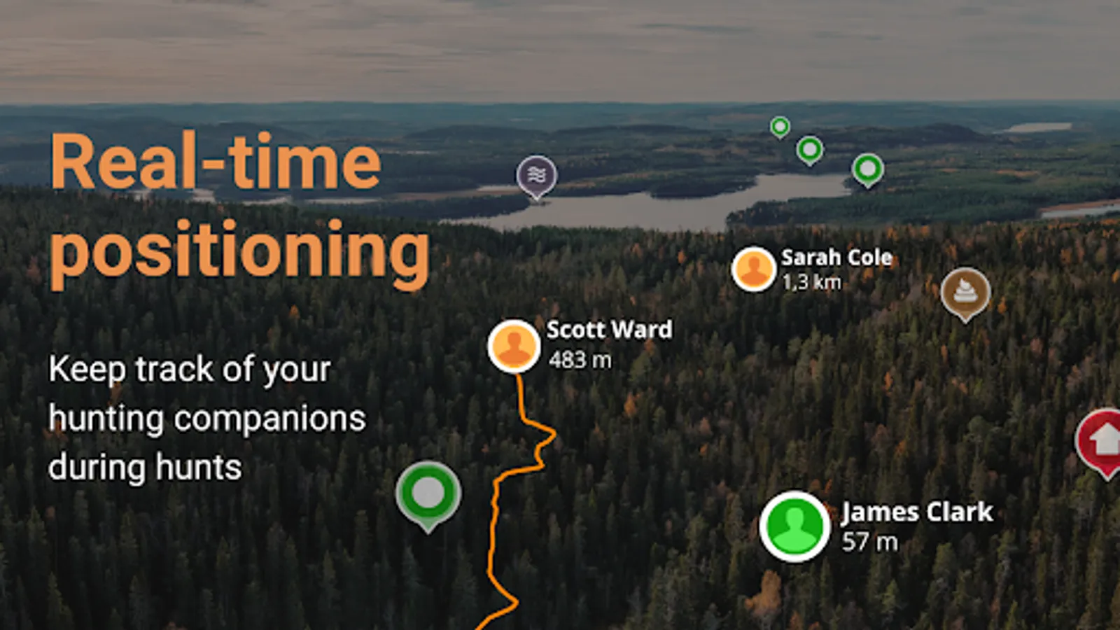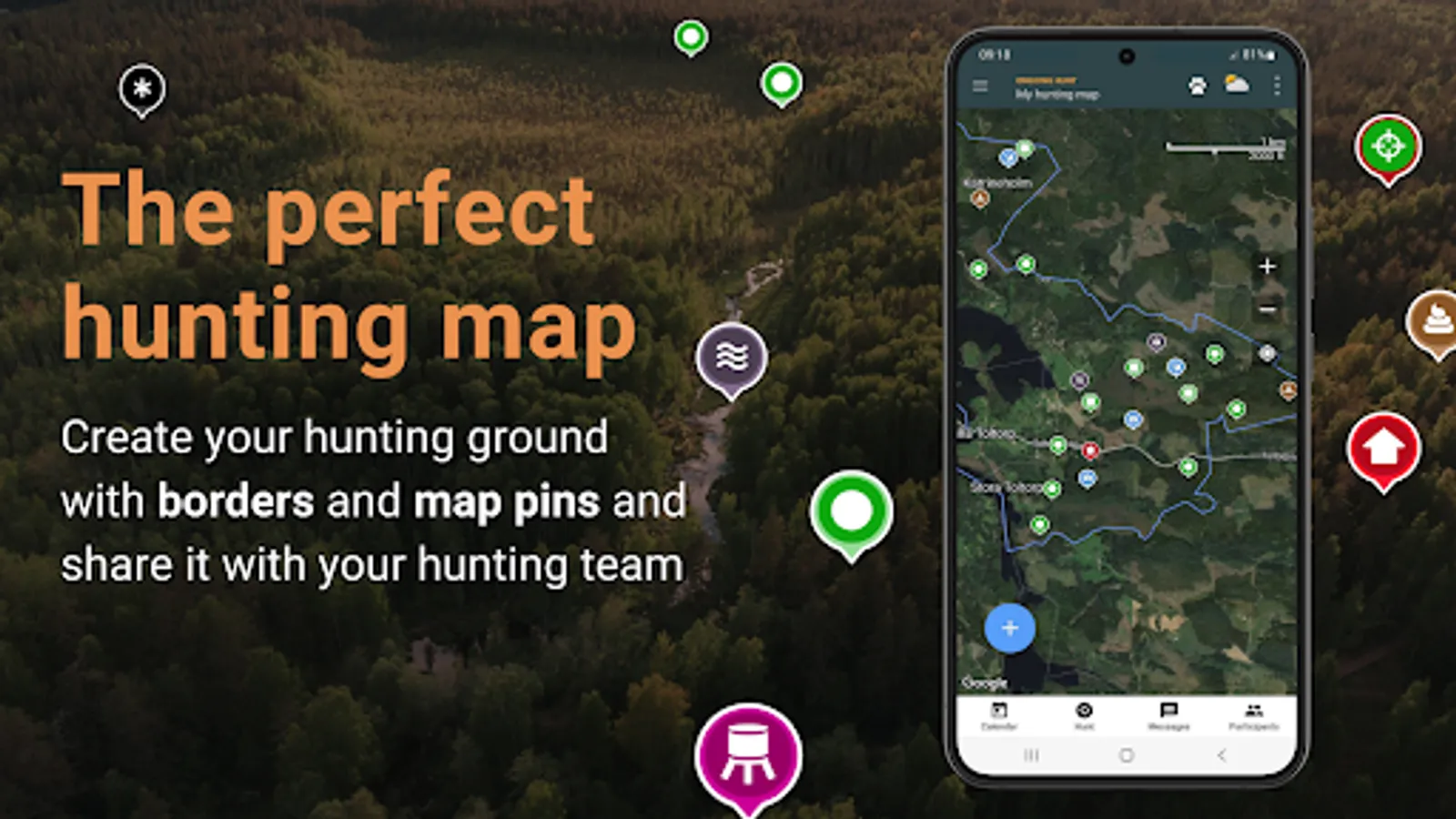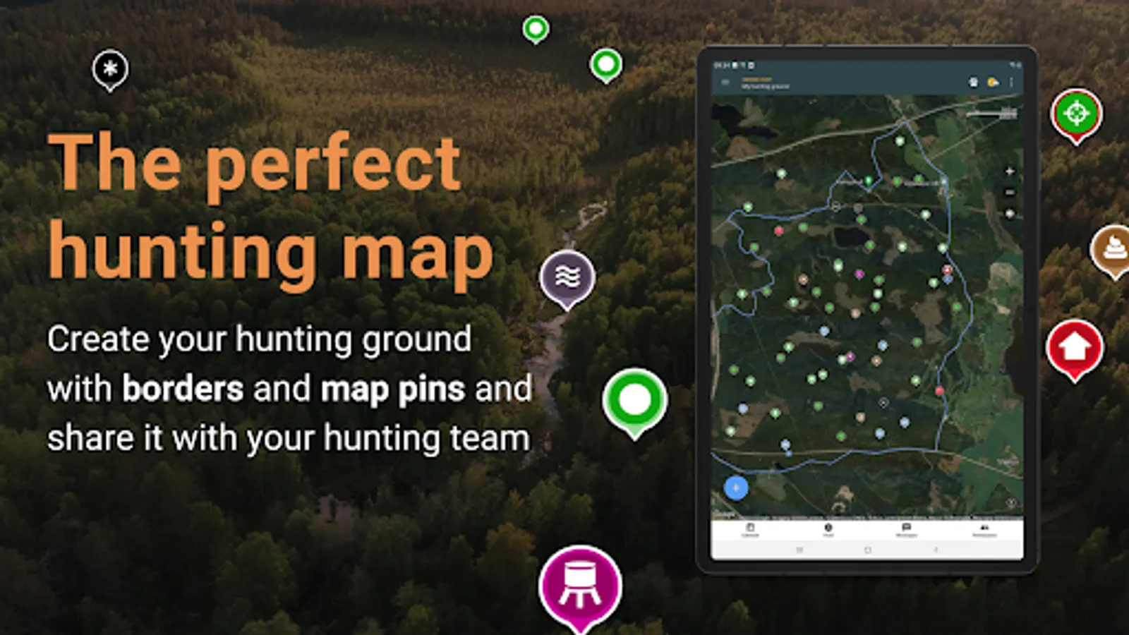 Simplify the hunt by creating your hunting ground with borders and map pins such as high stands, gathering places and tracks and share it with your hunting companions.