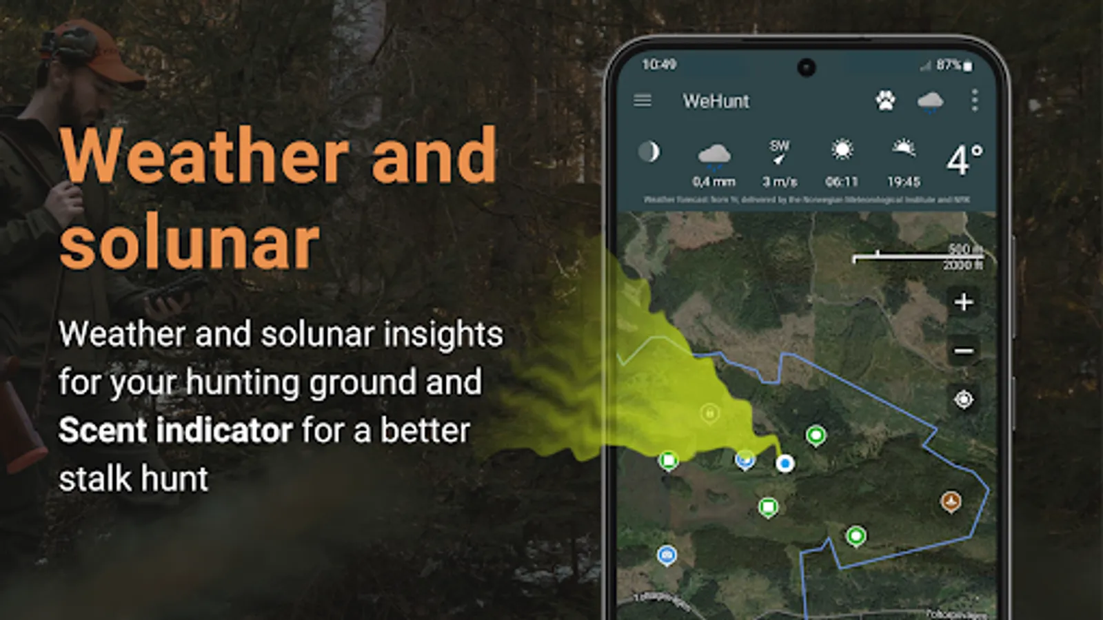 WeHunt contains a number of functions that make your hunting easier. You can, among other things, keep track of the weather and wind on your hunting ground and use the Scent indicator to see the wind from your position. Connect game cameras to the app and get all the pictures in one place, record your tracks on the hunting ground or collect statistics in hunt reports.