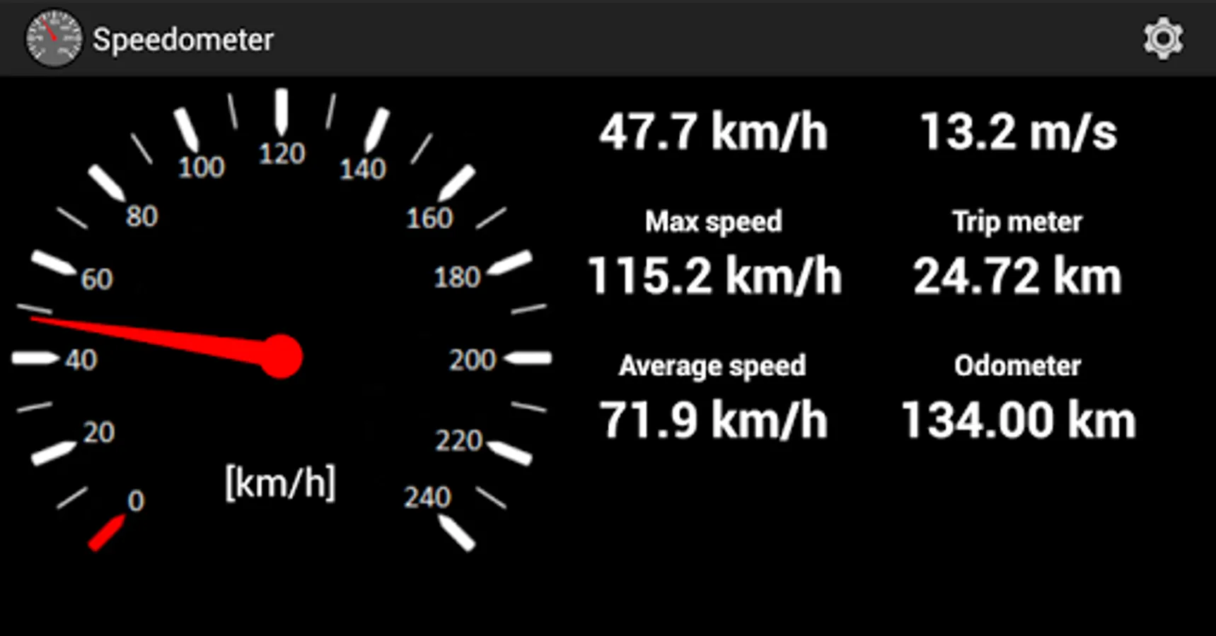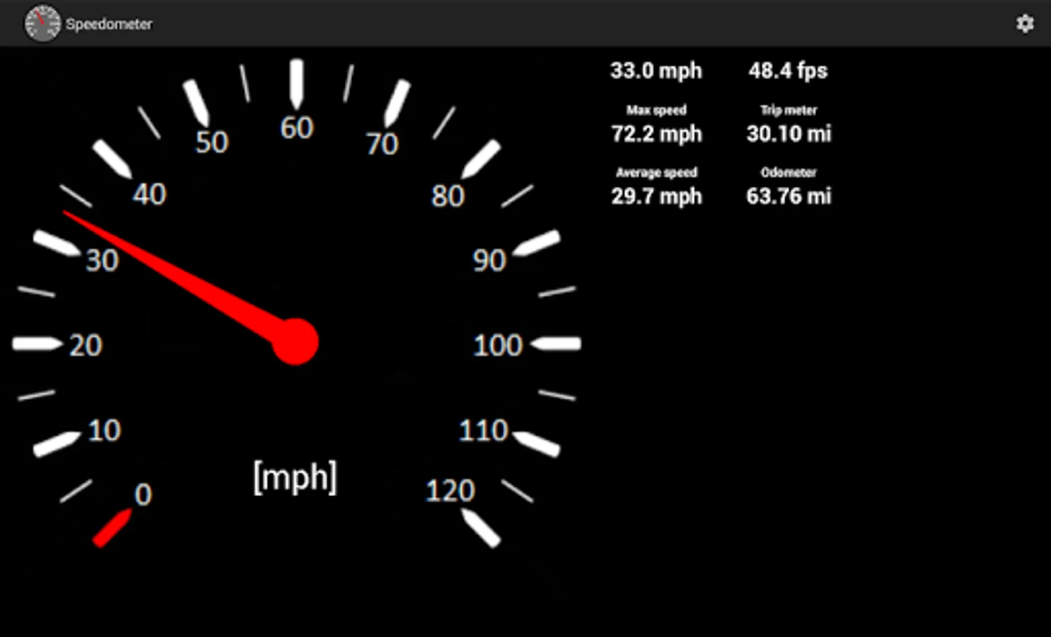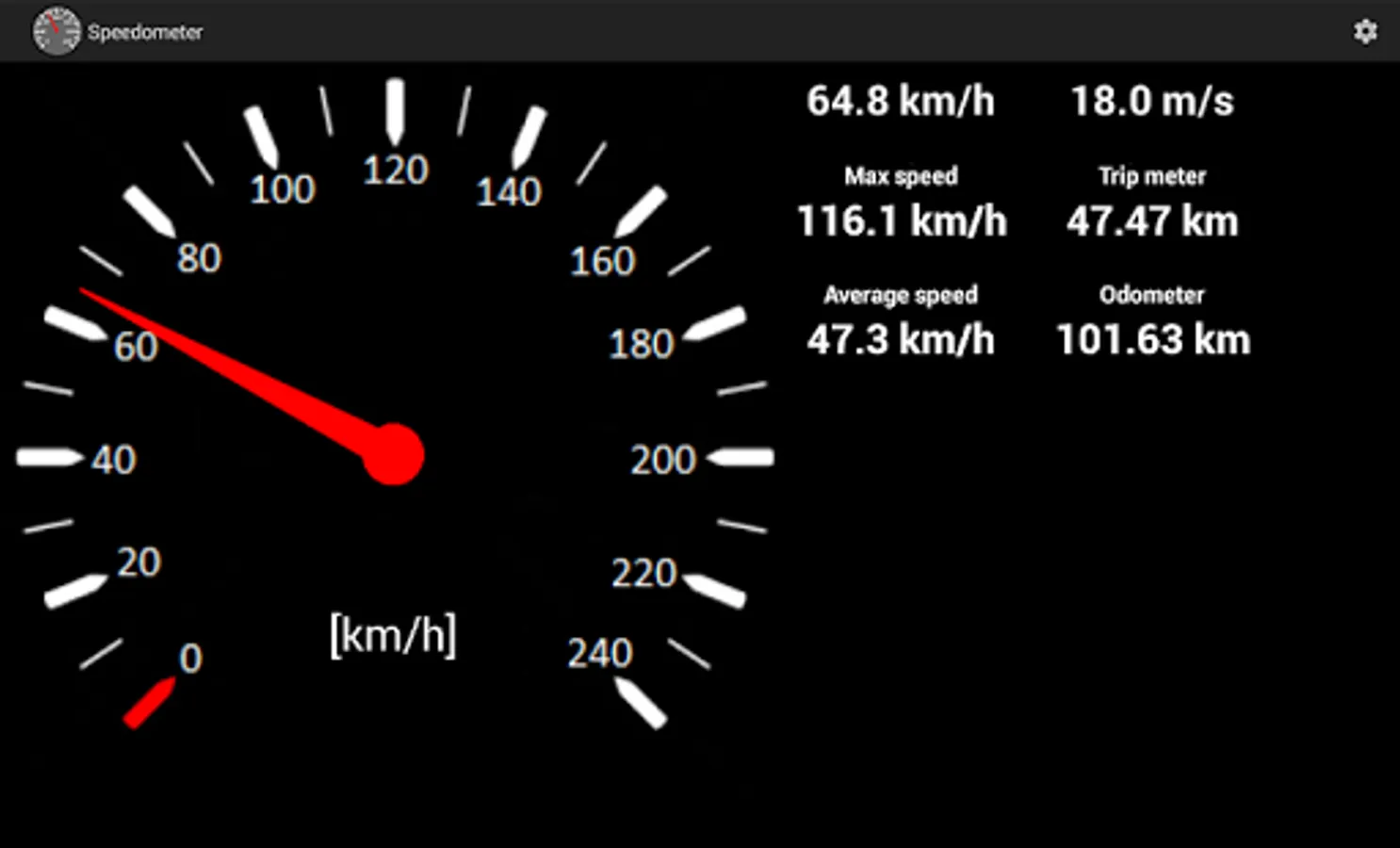 This application is a GPS-based Speedometer showing the speed of the device it is installed on. The speed is displayed both with an analogue gauge and as a digital value.