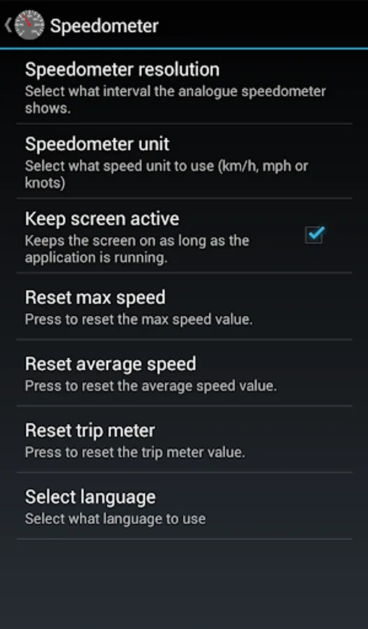 * Choose from four different speedometer resolutions for the analogue gauge: 0-30, 0-60, 0-120 or 0-240 speed units.