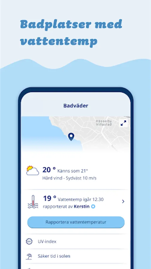 Water temperature for bathing places in Sweden. You can see water temperature reports from the municipality and other Ready users. You can also report the temperature yourself. The municipality's report also contains water quality and algal bloom.