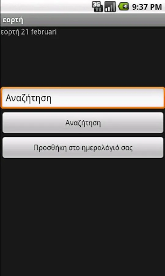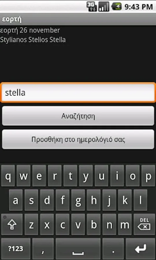 The greek version of the nameday program. Displays the name day the day the program starts, and it is possible to search by name to find out which day the name is celebrated. It is possible to add an event to the calendar. Please report bugs.