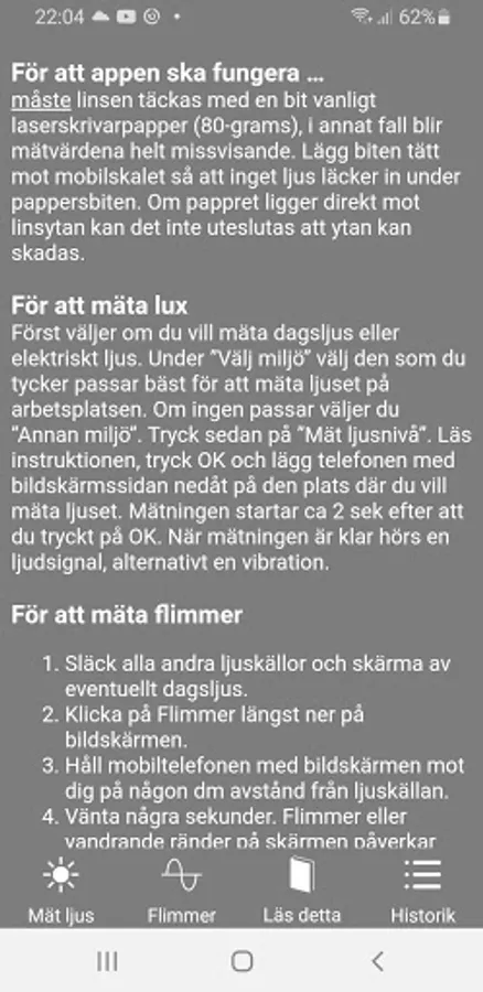 Measure light with your mobile by using the Swedish Work Environment Authority's app Light. With the app you can measure daylight and electric light as well as flicker.