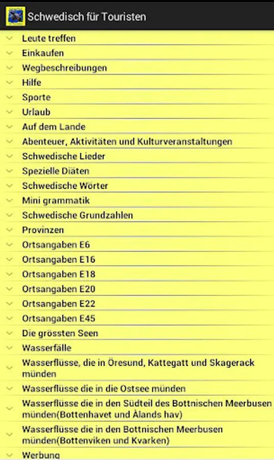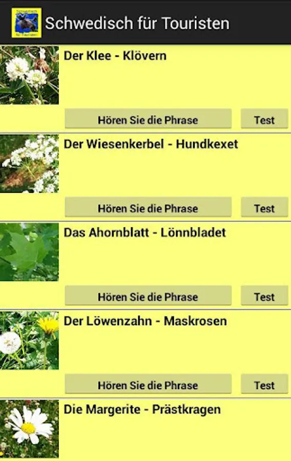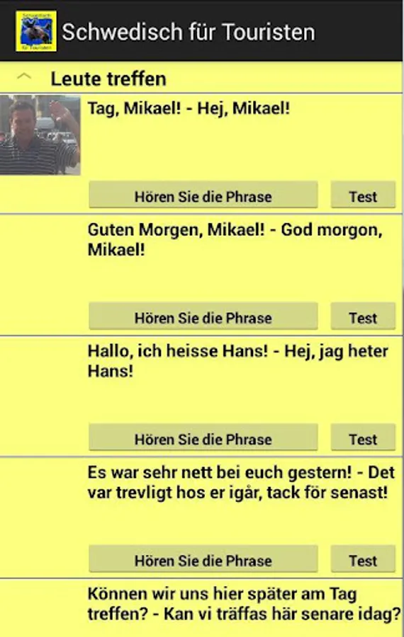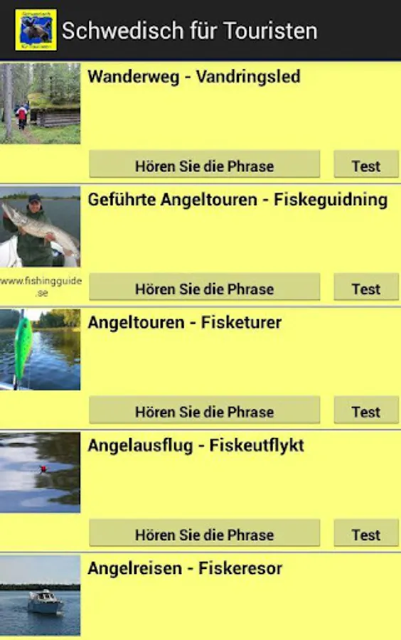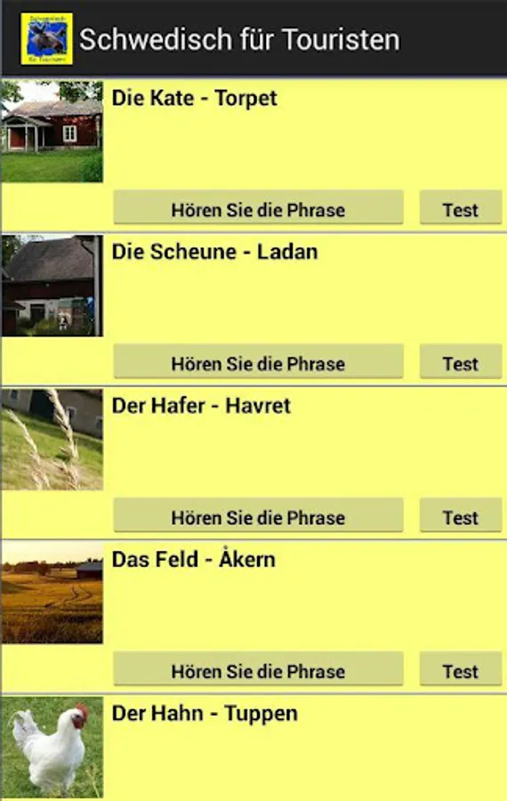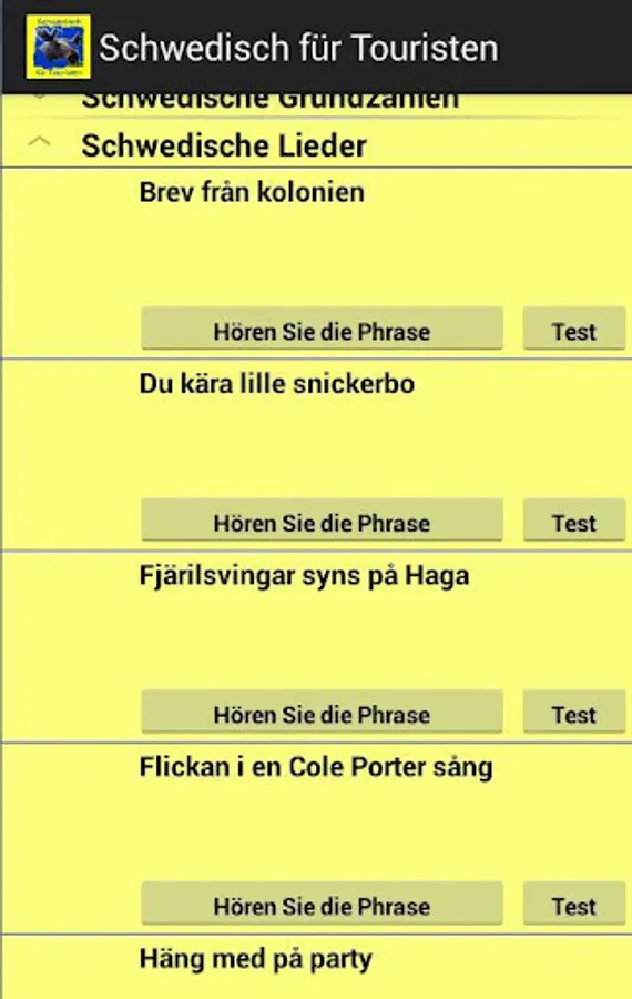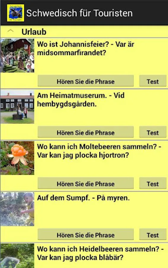 The app is a teaching tool for self-study of the Swedish language. It contains various images, phrases and words that may be the German tourists in Sweden to assist you. For each German phrase and each German word has a corresponding Swedish phrase and a corresponding Swedish word who will be playing in Swedish.