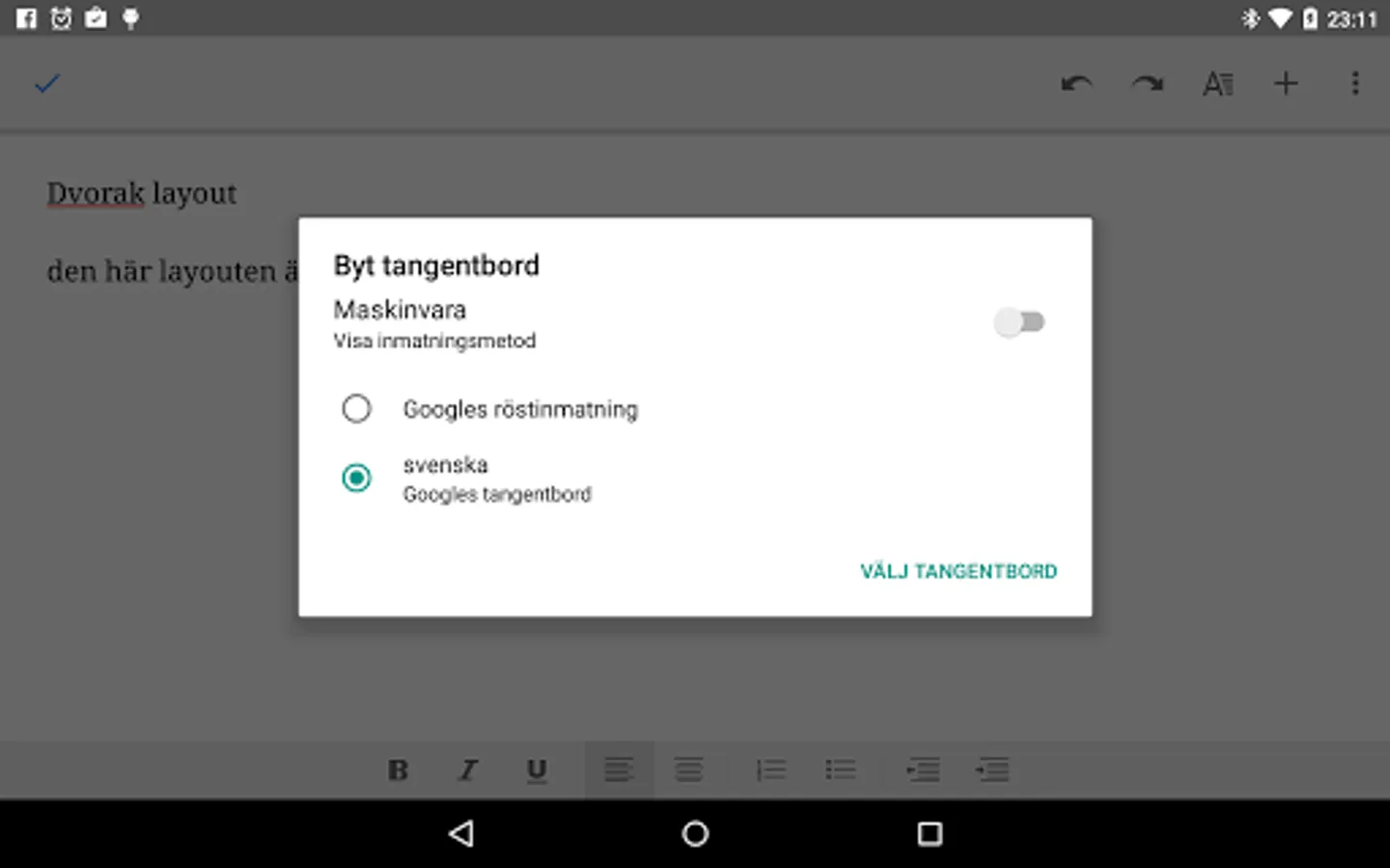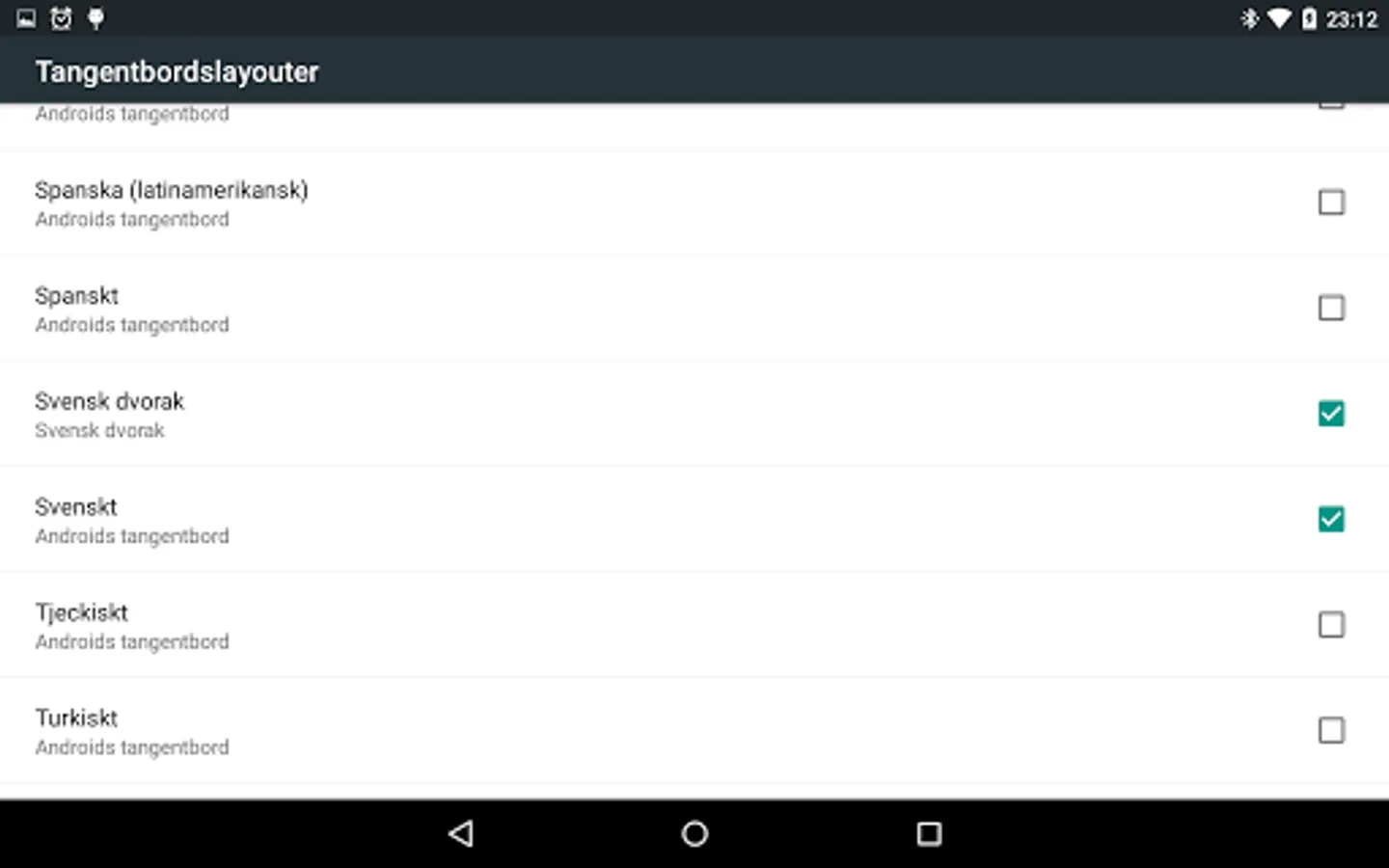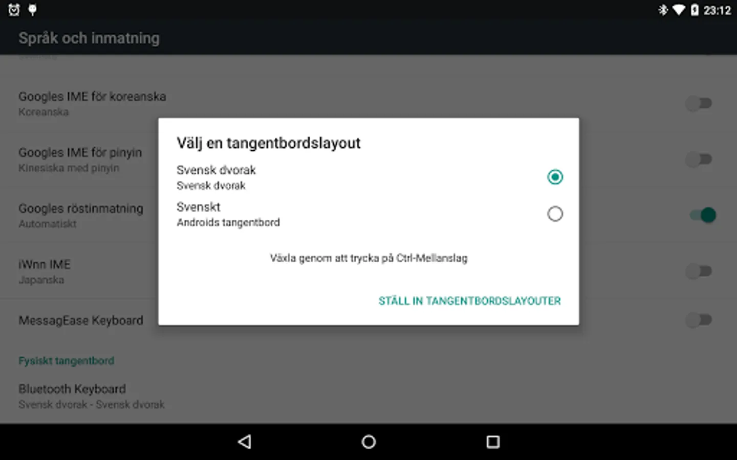 After installing the layout, connect a keyboard, enter the settings.> Language, and entries and choose your physical keyboard settings. Then add "Swedish Dvorak" as new layout.