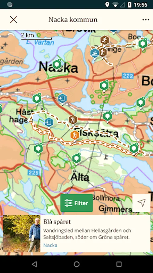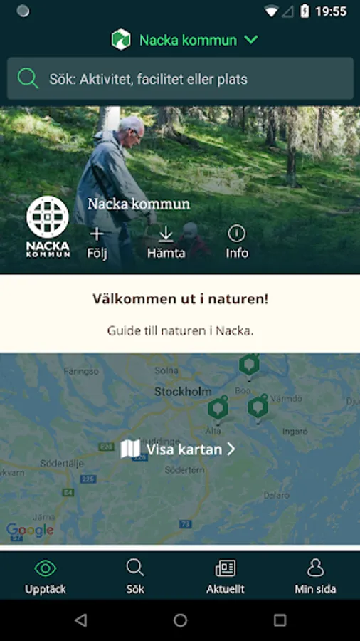 Nacka's guide to nature in Nacka. It has beautiful pictures and descriptive texts of hiking trails and nature areas. You get help to find entrances to the areas, information about swimming, lookout points and other points of interest. You can start from the map itself or from a destination you are interested in. Be inspired for a visit to the Nacka's beautiful nature or take the app to help orient you when you are out.