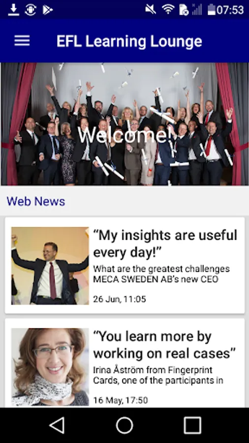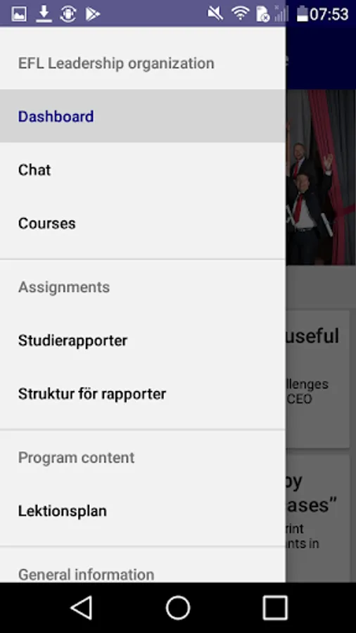 Genom EFL Leaning Lounge appen har du som programdeltagare ditt kursmaterial tillgängligt i din telefon var du än befinner dig. Du har även möjlighet att kommunicera med andra kursdeltagare och till programmet kopplade lärare och facilitatorer samt att skicka in inlämningsuppgifter med mera.