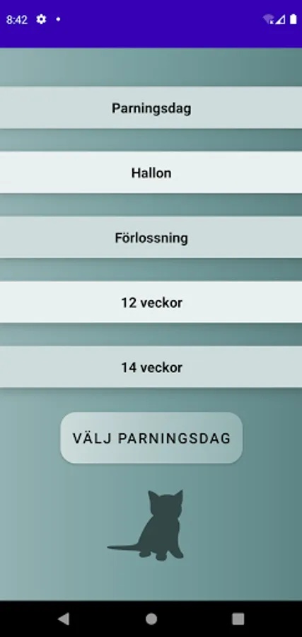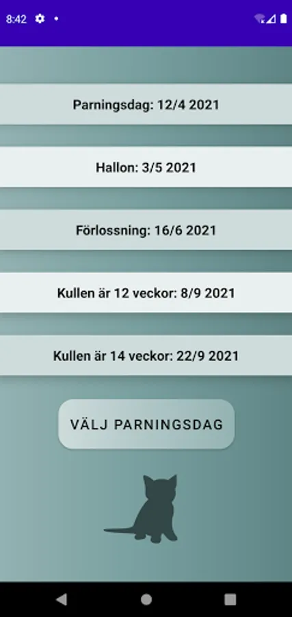 The app for you who are a cat breeder and want a quick and easy tool to calculate the cat's preliminary birth, there are also dates for pink raspberries on day 21, and you also get preliminary dates for when the litter is 12 weeks and 14 weeks and they legally may leave the cat mother according to Swedish rules.