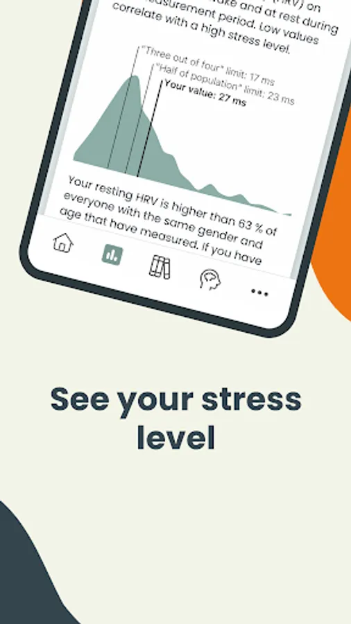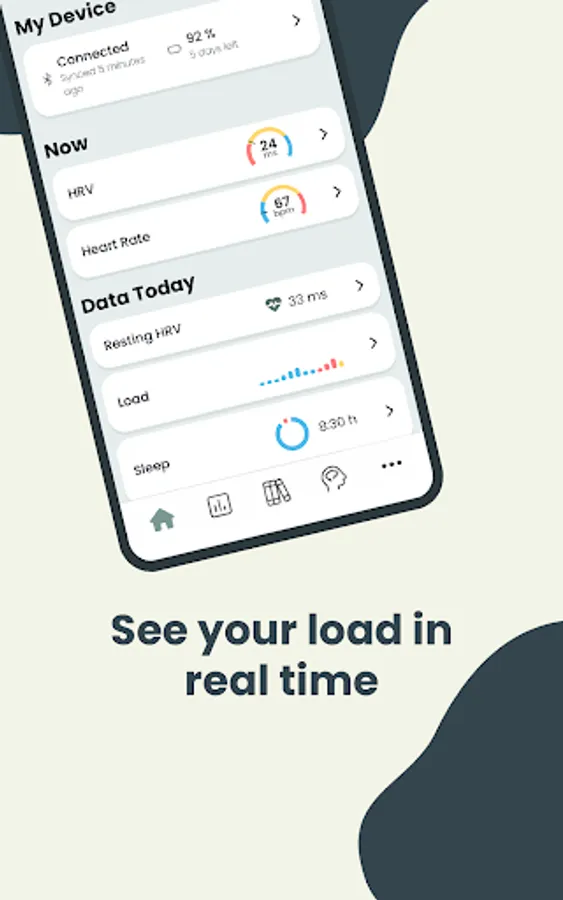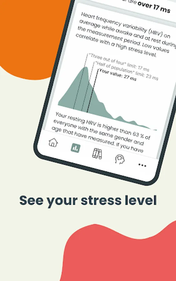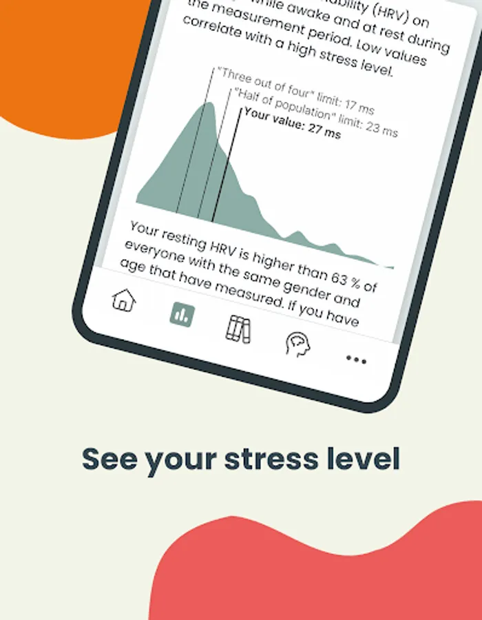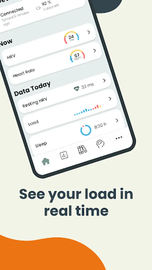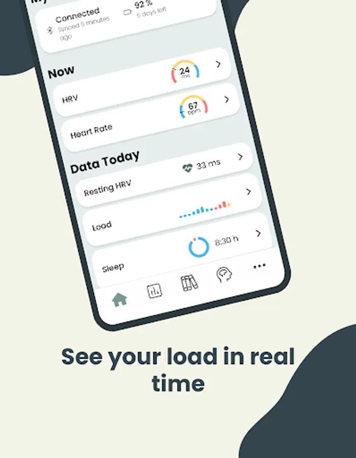 - Stress level: Your resting HRV (heart rate variability) showing the balance between stress and recovery. Load graphs 24/7.