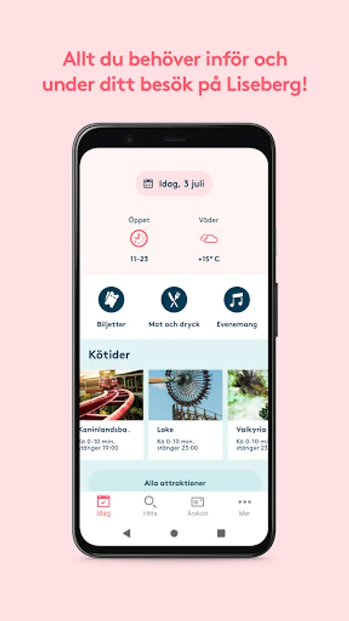 • Virtual Queue - Stand in line, without standing in line. We are now introducing Virtual Queue to several of our most popular attractions where you can queue directly in the Liseberg app. The app keeps track of your queue time and in the meantime you can do lots of other fun in the park and at the same time avoid congestion.