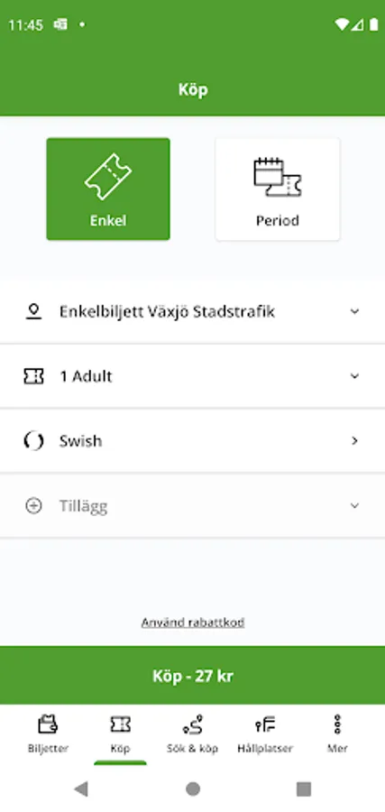 Buy a ticket with a predetermined geography under "Buy" or based on the trip you searched for under "Search & buy". Pay easily with Swish or debit card.
