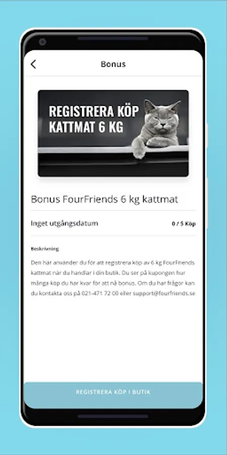 Bonus registration applies to the products dog food, cat food and cat sand. The FourFriends app provides you with unique offers and promotions that run throughout the entire FourFriends range.