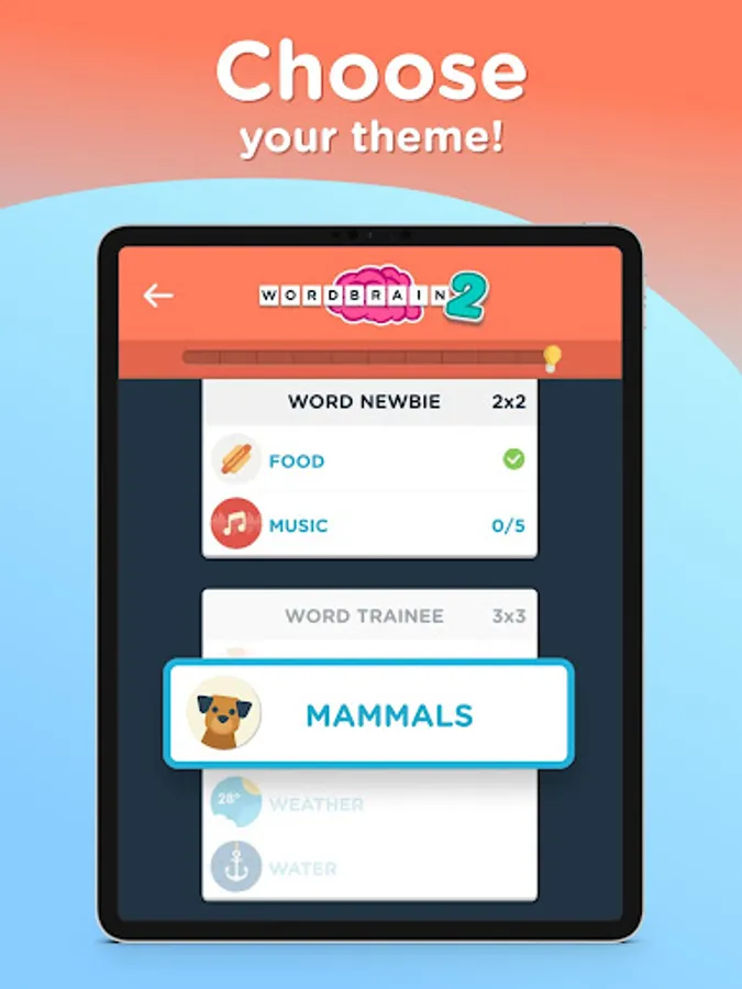 Complete the levels with themed puzzles and advance from being a simple Word Newbie to a Super Word Mastermind! The increasing level of difficulty, with themes ranging from Food to Space, will challenge even the toughest Brainiacs out there.