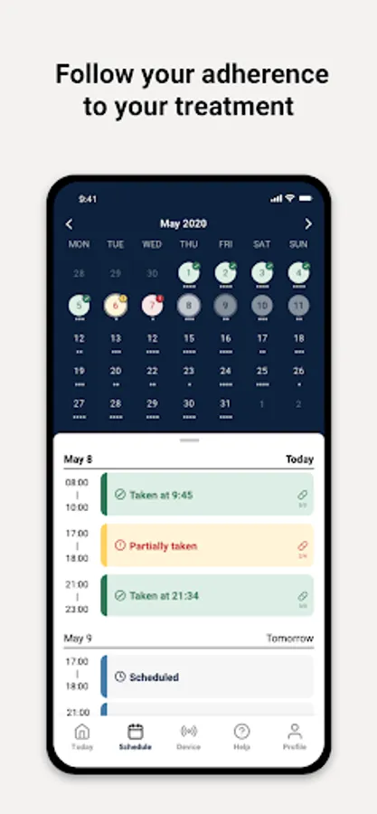 - Calendar view with a log of taken, taken late, early, partially, or missed doses
