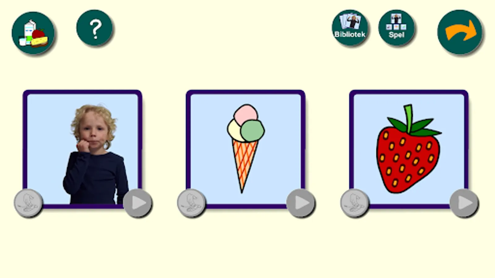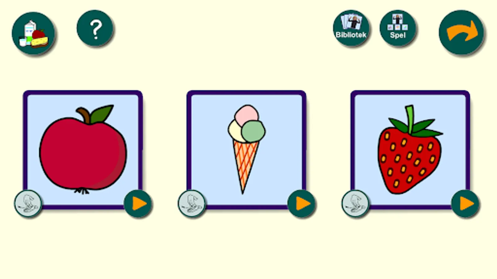 In the library, you can explore sign language by choosing between three words. There are three cards with drawn pictures representing the words in a certain category. A movie is played with a child drawing. The word is said out loud as an aid to hearing.
