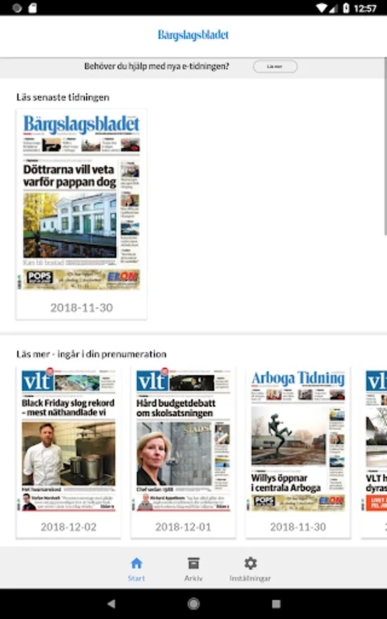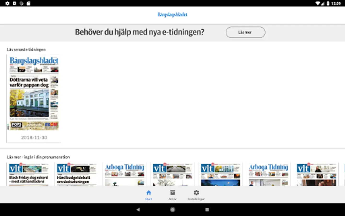 As a subscriber to Bärgslagsbladet, you also have free access to both Arboga Tidning and VLT in your e-newspaper app. And you have the opportunity to buy a favorable additional package that gives you access to Aftonbladet's e-magazine.