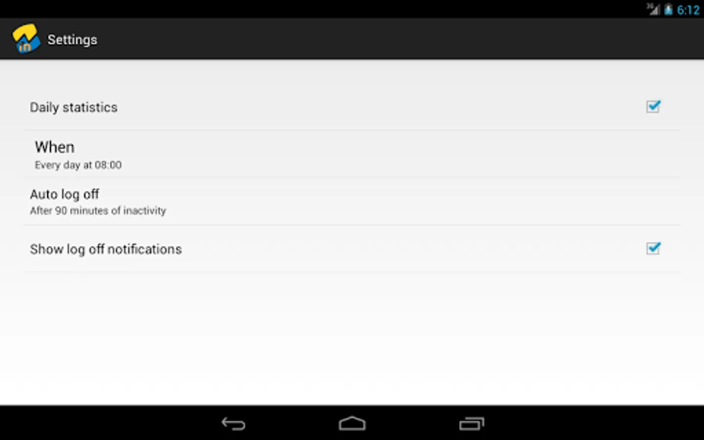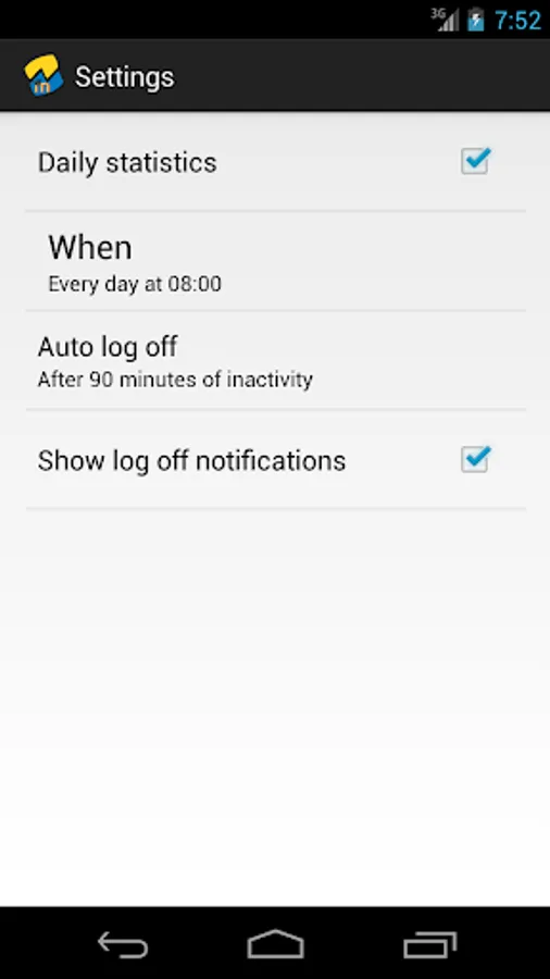 To get daily reports, open the settings and check the "Daily statistics" option. Then select the time you want the report delivered. For daily reports to work, you must have ticked in "Remember me" on the login page and filled in your login information.
