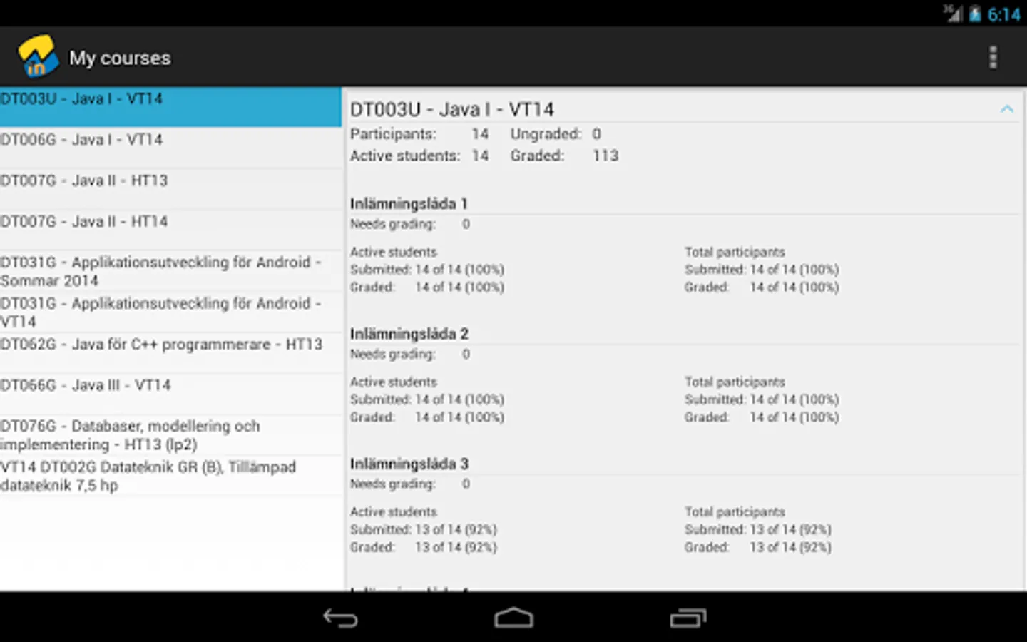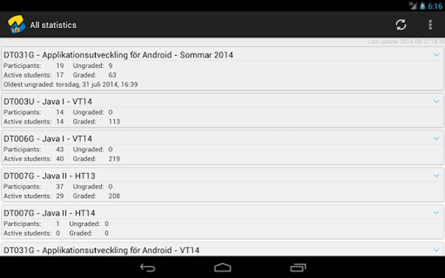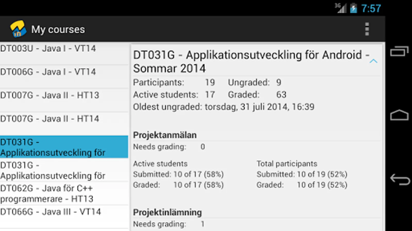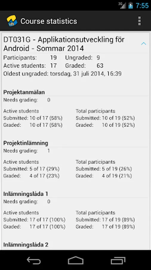 With this app you can list all your courses in Moodle and get daily detailed statistics on the assignments. The statistics presented include: