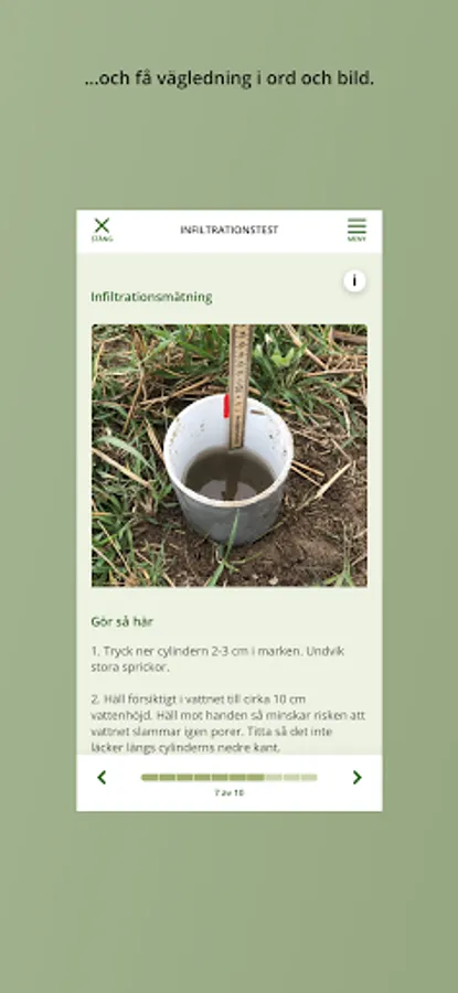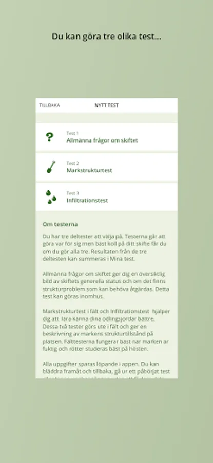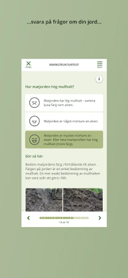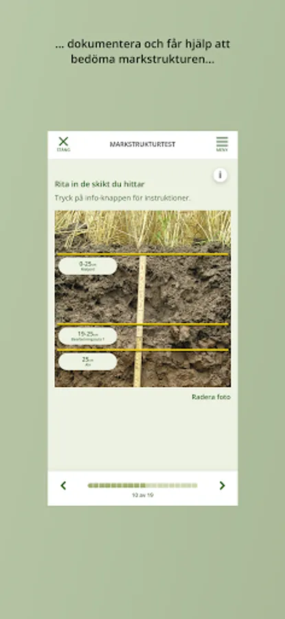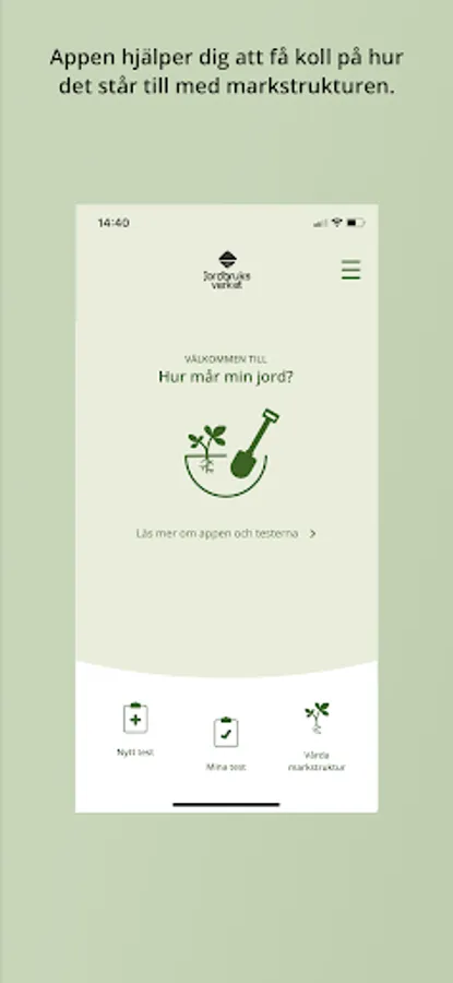 The app helps you get a handle on the soil structure of your farmland. You receive educational guidance in performing the app's three subtests, can make action lists to maintain and improve the structure and follow up on changes. A good and stable soil structure is the basis for a well-functioning agricultural soil. You can choose Swedish or English as the language in the app.