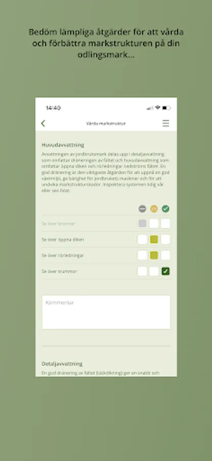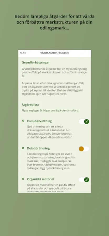 The app contains examples of measures to care for and improve the soil structure. You can make your own checklist for the measures you think are most suitable for each shift on the farm.