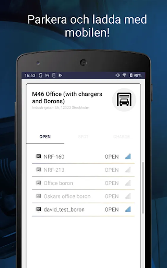 In Park46 you can administer your agreements, change payment method and of course open the door to your garage and your place. If you have an agreement for electric car charging, you can also start the charger via the app.
