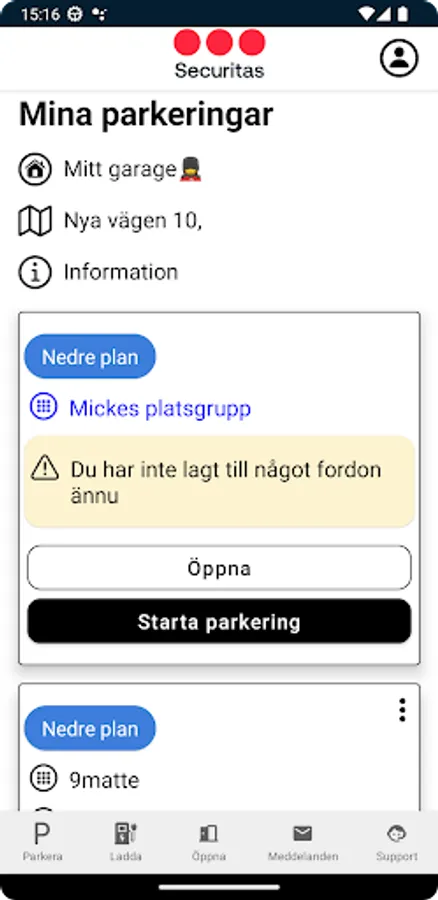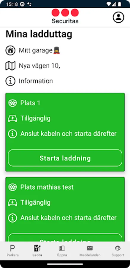 In Securitas Parking you can administer your agreements, change payment method and of course open the gate to your garage and your place. If you have an agreement for electric car charging, you can also start the charger via the app.