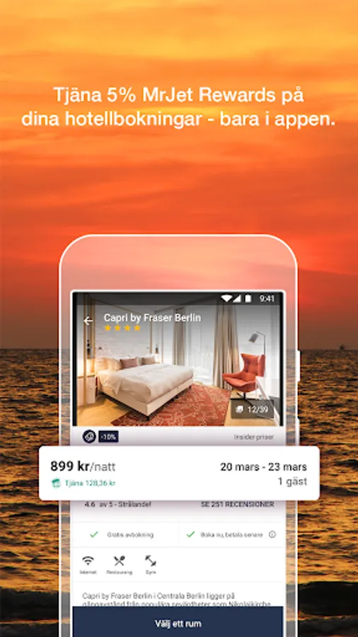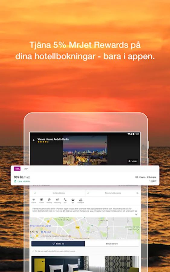 Join MrJet rewards program, MrJet rewards and start earning Rewards on your flight tickets and hotel bookings that you can instantly redeem on hotels in the app – app bookers earn 5% on hotels and 2% on air! You can also find cheap last-minute hotel rooms nearby and save up to 40% on your reservations with great mobile exclusive deals!
