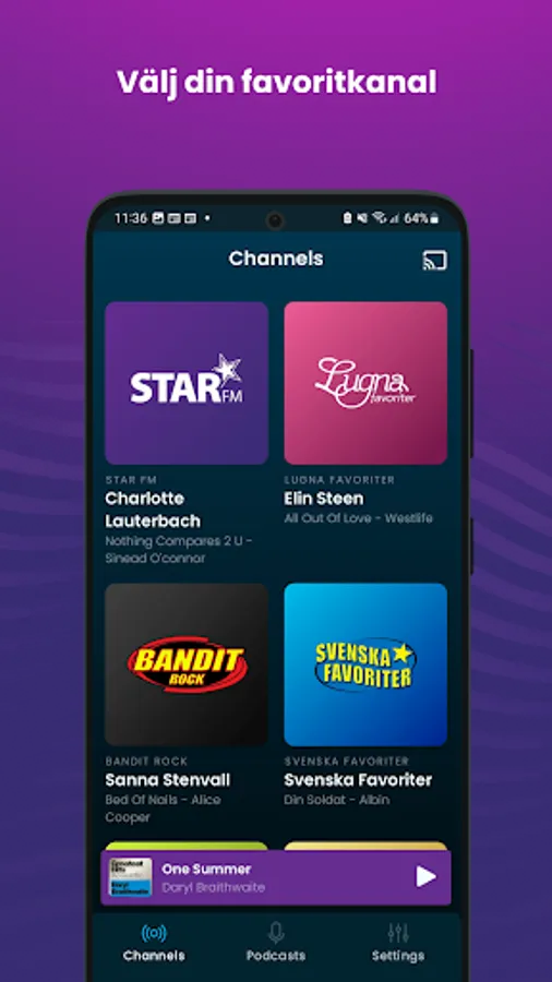 We have gathered everything from popular stations like RIX FM, Lugna Favoriter, Bandit Rock, and Power Hit Radio to tailor-made stations like Disco54, HitMix90s, Julkanalen, Svenska Favoriter, Bandit Metal, Bandit Classics, Indie 101, Dansbandsfavoriter, Country Classics, and more.