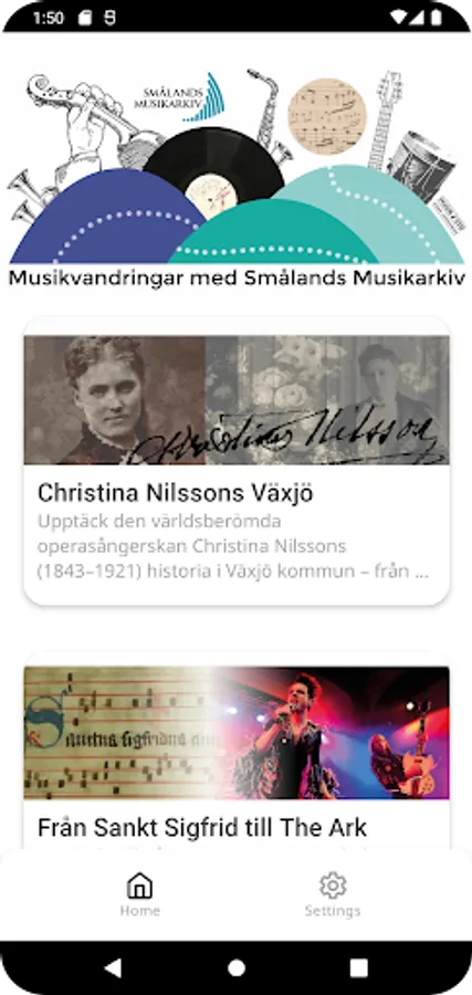 “Musical Walks with Småland’s Music Archive” leads you to various places of musical importance in the county of Kronoberg, Sweden. Discover Växjö’s rich music history from the 13th century and onwards, enjoy the local popular music in the region, or follow in the footsteps of the world-famous opera star Christina Nilsson (1843–1921). The musical walks, which are available in English and Swedish, present unique audio-visual material and knowledge. Download the app, follow the walks, listen, learn and enjoy!
