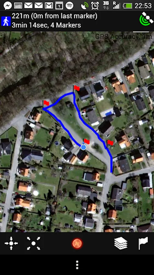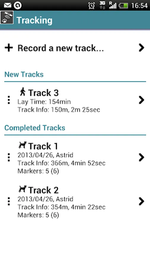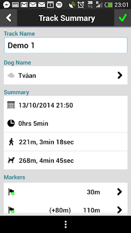 With DogTracks you first walk the track and lay the markers. When the track is finished you will see a map of the track with the markers. A summary will show the length of the track, number of markers and the time it took for you to walk the track.