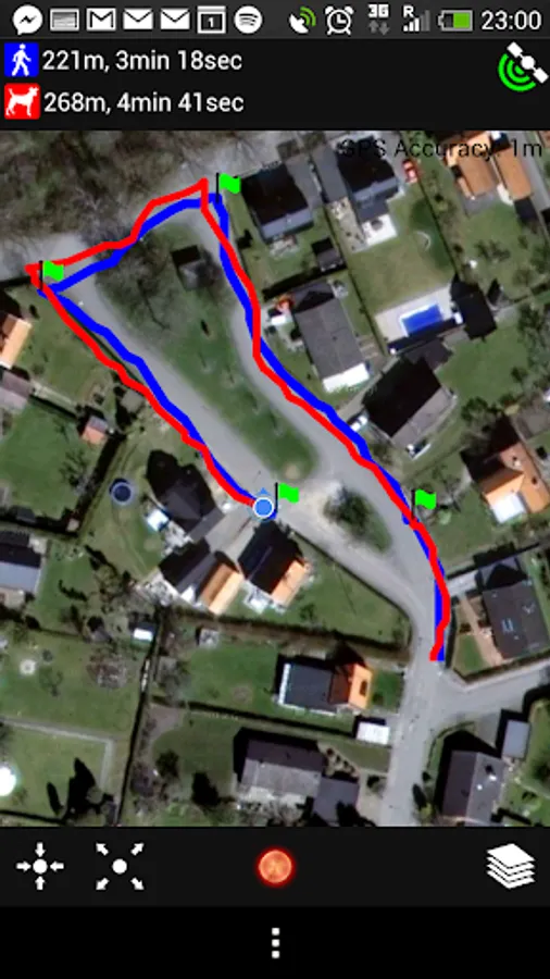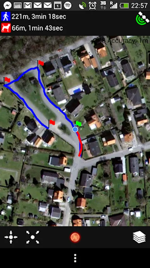 When your dog walks the track DogTracks will draw a new track on the map and automatically mark the markers your dog finds. You will see the track you walked and in real time follow your dog's track.