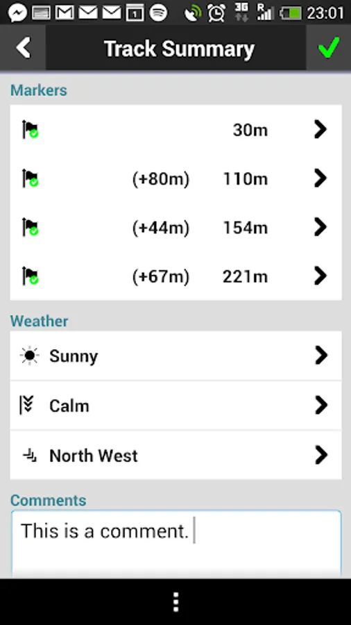 After you and your dog have walked the track you will see a map that shows both tracks, which marker your dog has found, track length and time. You can log weather and wind conditions and also write your own comments.