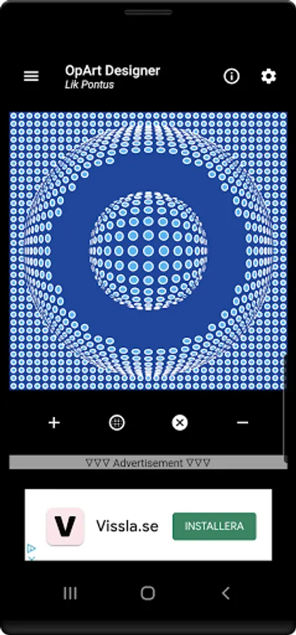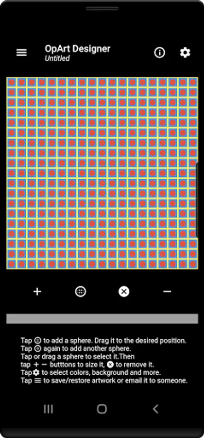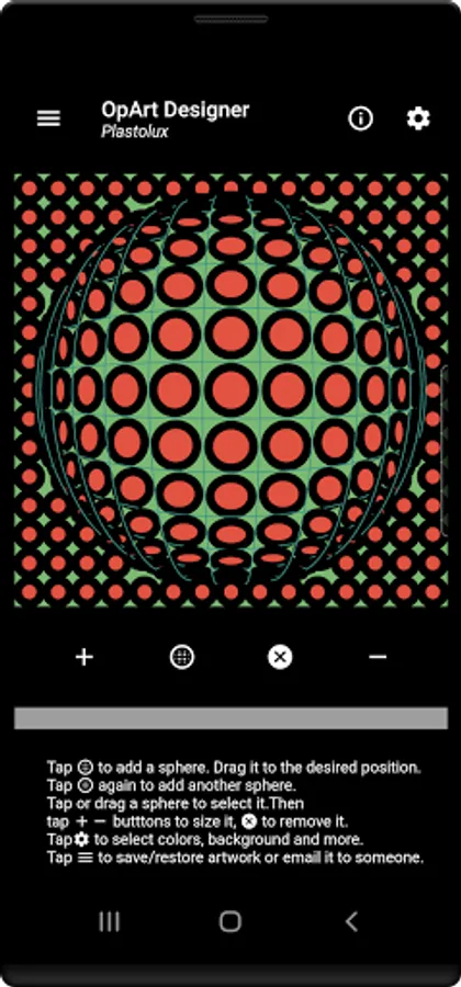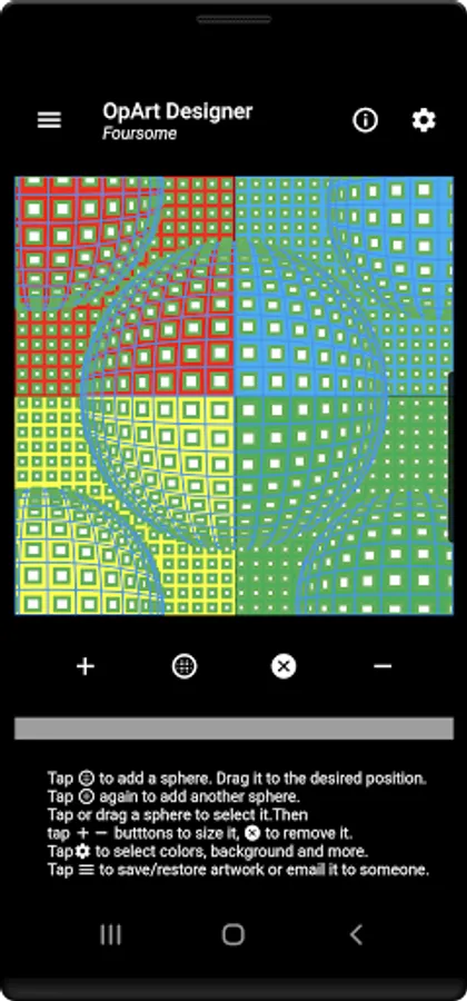 If you like op-art (for example, Victor Vasarely's art) you will love this app. Design your own artwork, give it a title, save it, and/or send it to your computer for printing - it's free!. Browse all saved pieces, select and restore one, and continue to work on it. Share it from the Gallery to Facebook, Twitter or whatever. With version 2 you get a new color saver, and you can choose resolution for saved images up to 16 megapixels - enough for printing a poster.