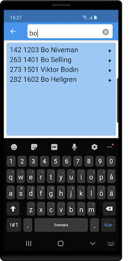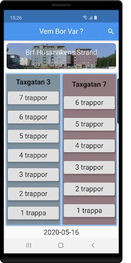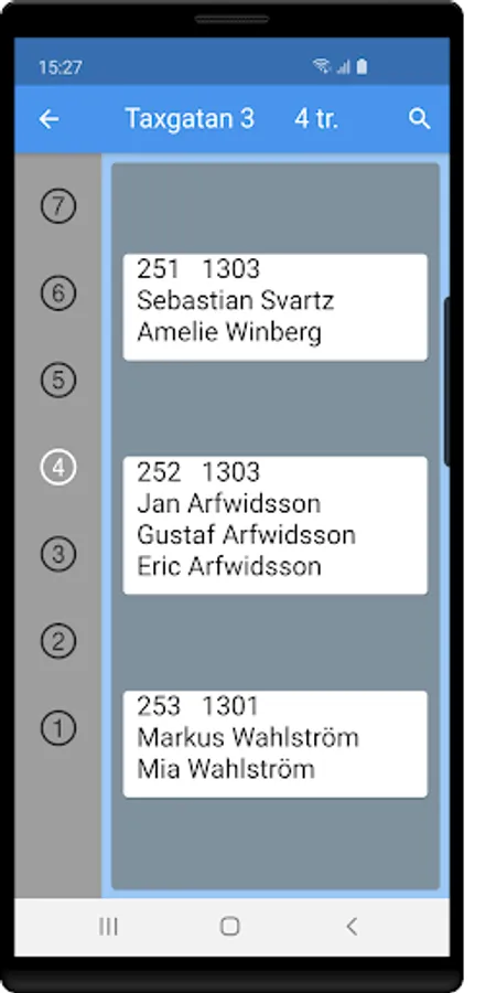 Quickly check who lives on a particular floor on Taxgatan 3 or 7. Or search by name or apartment number.