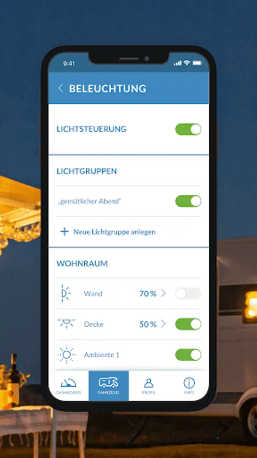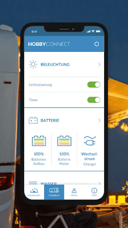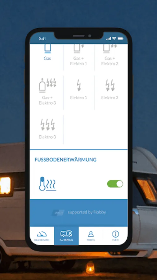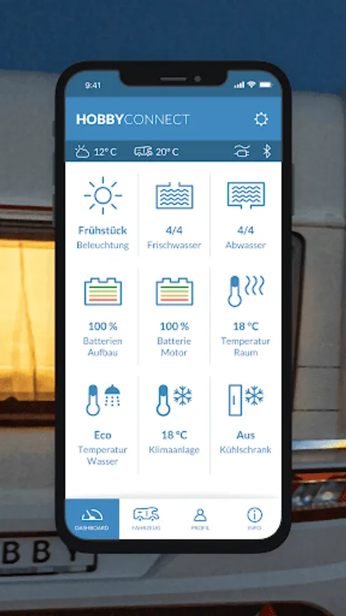 With HOBBYCONNECT you control many important functions of your hobby caravan, motorhome or box van from your smartphone. Activate air conditioning or heating, check battery and fill levels or save light settings - all with the app.