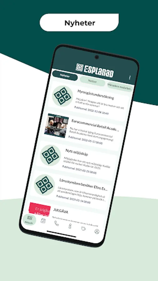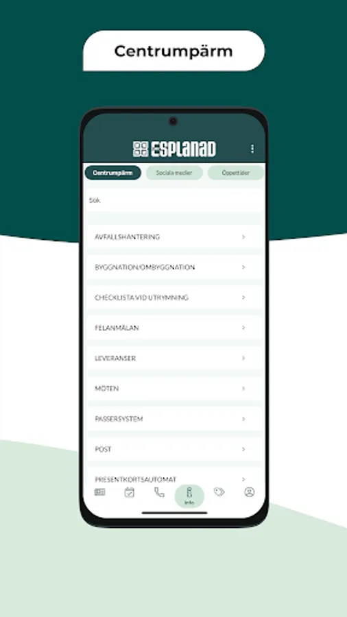 App for employees at Elins Esplanad. The purpose of the app is to ensure that all employees have access to information about the shopping center and what is going on in the form of activities but also construction, change work, development of Elins. The app essentially replaces the previous center folder. The app also contains contact details for Elin's important functions such as operating company, security company, center management and other stores.