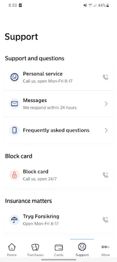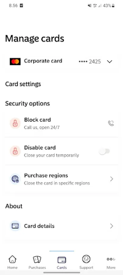 • Manage safety settings for your card, e.g. enable online purchases ( only SE) and choose to block the card for purchases in specific regions. If the card is missing, the card can temporarily be disable