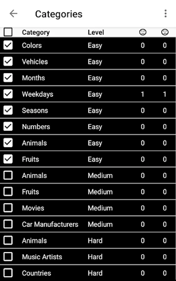 In Hangman you choose freely one or more categories to play (the default app setting is easy):
