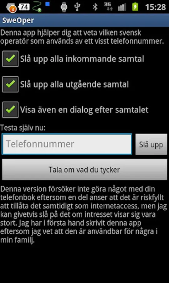 This app is really only meaningful to use in Sweden since it will try to look up the Swedish operator for a given phone number.
