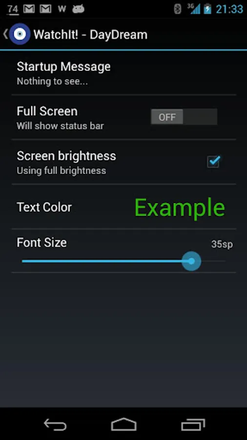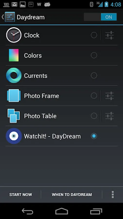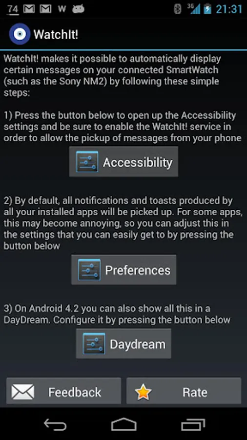 Currently there is support for SmartWatch and SmartWatch 2 by Sony, MetaWatch, Smart Wireless Headset Pro (MW1), experimental support for Gear (not working) plus the DayDream feature of Android 4.2+ - see the screenshot above for an example of what is shown when an email arrives. This works on phones as well as tablets (and most likely anything else running 4.2) - select it as any other DayDream.